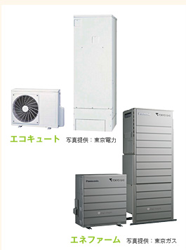 家庭のエネルギー消費量の約3割が給湯で、実は一番大きな割合を占めています。だからこそ、省エネを考えるときに注目したいのが給湯設備です。高効率給湯設備で代表的なものはエコキュートとエネファームがあげられます。ヒートポンプの原理を利用してお湯を沸かすエコキュートは太陽で暖められた空気の熱を上手に使うことで、投入した電気エネルギーの3倍以上の熱エネルギーを得ることができます。また、マイホーム発電であるエネファームは都市ガスから水素を取り出し、空気中の酸素と化学反応させて発電。その際の排熱を給湯や暖房に利用するのでエネルギーのムダがなく、CO2も大幅に削減できます